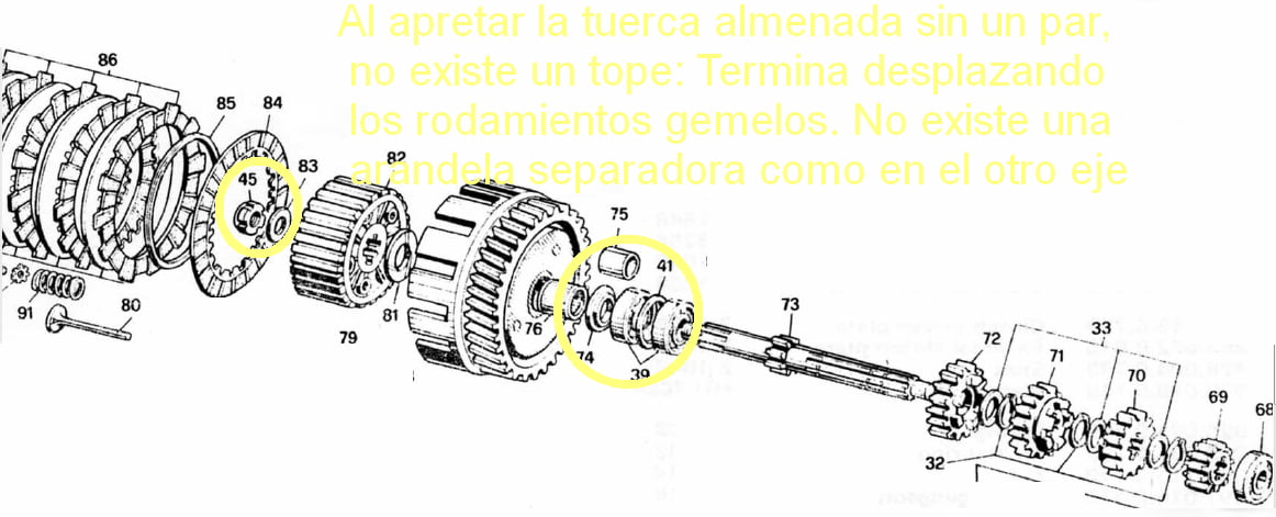 Localizado el (los) fallos (demasiado tarde: ha roto el cárter superior): 1- Al montar la maza de embrague y apretar la tuerca almenada, los dos rodamientos gemelos del eje del embrague se han juntado unas décimas de mm, hasta bloquearse y no girar. Supongo que deberia de llevar una arandela espaciadora pequeña, entre ambos (no aparece en el despiece de fábrica). Porque la arandela espaciadora exterior, grande, sí estaba en su sitio. Pero no estaba libre, como debería. Esto ha repercutido a través de la cadena cinemática en la parte más débil, el tope del pedal de arranque sobre el cárter. 2- Al montar el eje del pedal de arranque, la pestaña que hace tope no estaba a 90º con respecto del fiador del muelle de recuperación, sino 45º más allá. Con lo que trabajaba forzado. Lo he solucionado comprando un carter de desguace. Si me decis cómo hacerlo, subo alguna foto. Gracias por vuestras ideas.